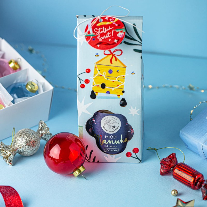 Szukasz wyjątkowego prezentu pod choinkę? Wybierz Miód Manuka prosto z Nowej Zelandii! To niewątpliwie najsłynniejszy miód świata - a znany jest ze swoich wyjątkowych właściwości. Najważniejszą jego cechą jest wysoka zawartość metyloglioksalu, w skrócie MGO. Nasze miody mają go aż 250+ lub 500+! Wybierz ten, który najlepiej Ci odpowiada, a my zapakujemy go w piękny kartonik ze świąteczną ilustracją i ozdobimy zawieszką z życzeniami Słodkich Świąt!